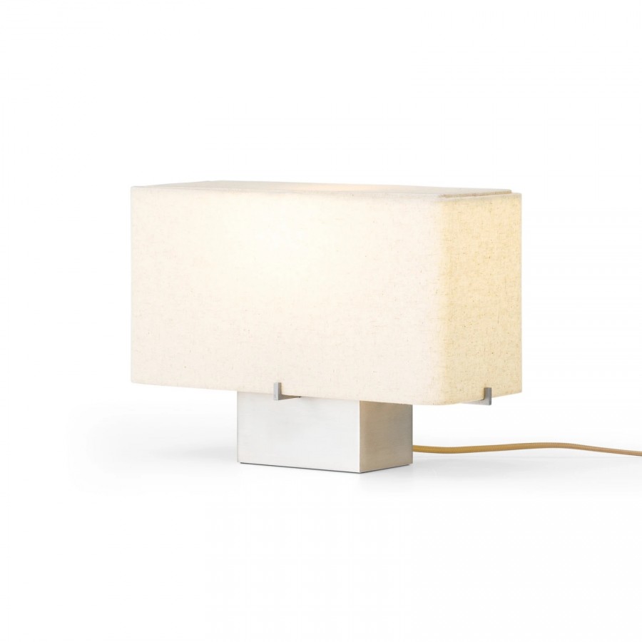 With a discreet switch and matching cord, the Nonna Table Lamp is lighting pared back to its most considered form. Pairing a subtly textured sand-coloured textile shade with a cool brushed aluminium base, the lamp is designed to highlight a narrow shelf, table or window sill.