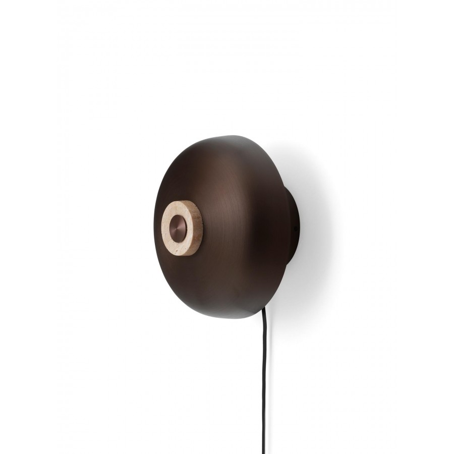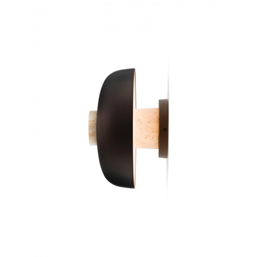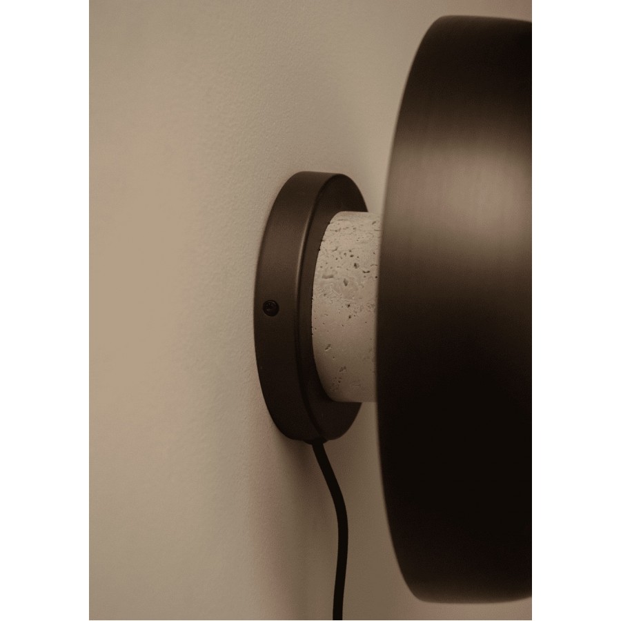 With the Reverse Wall Lamp there is a rawness in its materials and form which creates a characterful and unique light. The untreated travertine base of the lamp supports the curved bronzed aluminium shade, perfectly balanced. Coupled with dim to warm technology, the colour of light can also be altered according to preference using either the dimmer on the cord or enabled if hardwired.