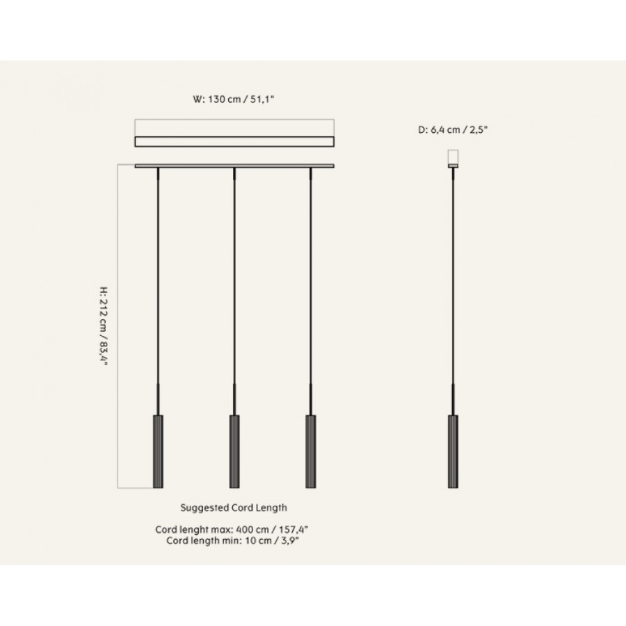 3 Pendants - Height: 212 cm, widths: 132 cm, depth: 6.4 cm. Shade diameter: Ø5.6 cm.