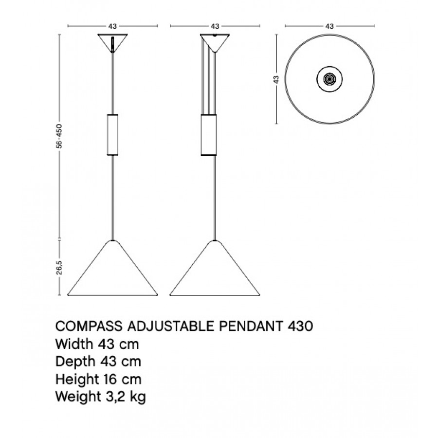 Compass is a series of lamps based on the classic pendant typology, unified by their distinctive conical silhouette. The angled shade is available in a classic model with fixed cord length, as well as a height-adjustable variant with counterbalanced weight that enables users to precisely position the direction and height to suit their preferences.