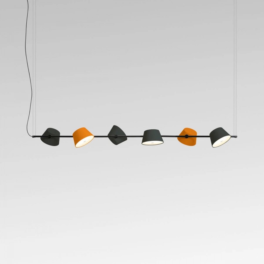The Tam Tam 6 pendant light features a central lighting bar with six lacquered aluminium lampshades. These shades can be rotated through 360º and feature an opalescent, methacrylate diffuser which softens the light. The bar structure is black lacquered metal. Any combination of shades may be chosen from the following colours: black, off-white, orange, olive yellow, brown, sand and silver grey
