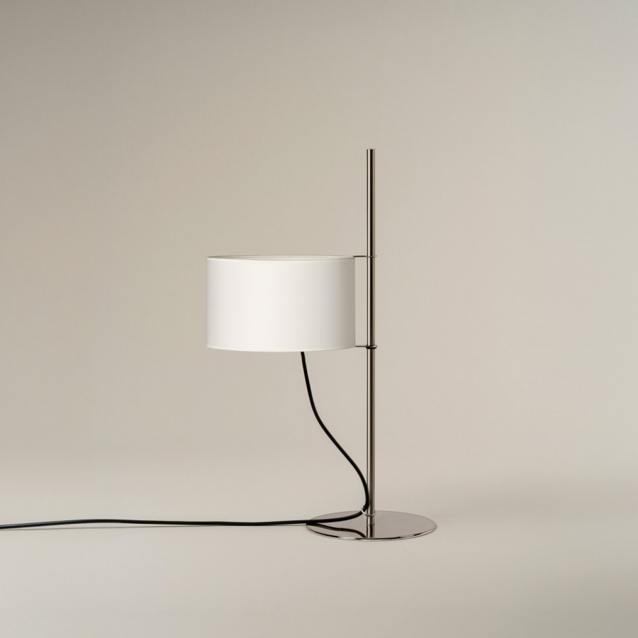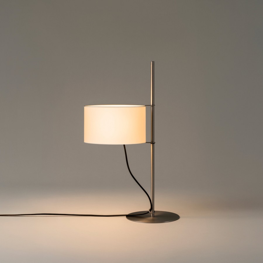 The TMD Table Lamp was commisioned as a table version of the TMM Lamp. In keeping with the original design, the shades height can be adjusted like a flag up and down a mast. To create a more table-friendly design, Milá exchanged the original wooden base for metal and the cross-shaped base for a circular one. The design of the cable hanging direct from the fitting serves as the on/off switch.