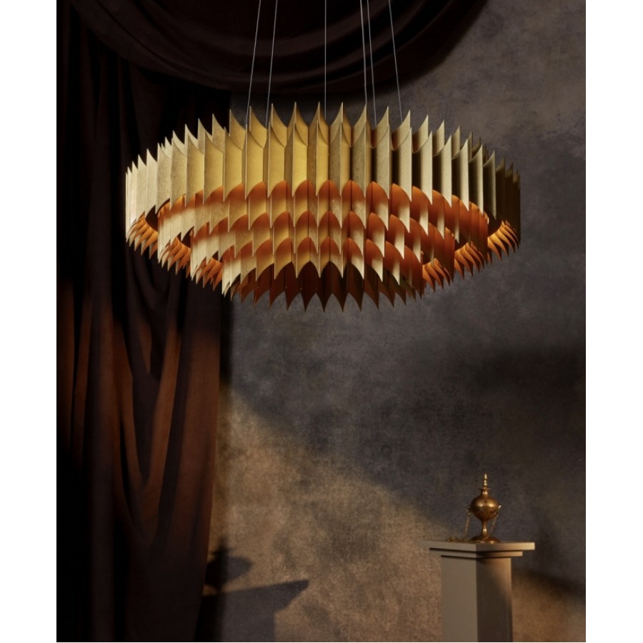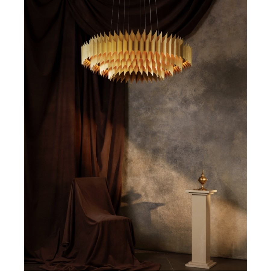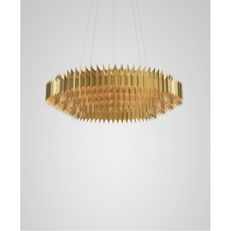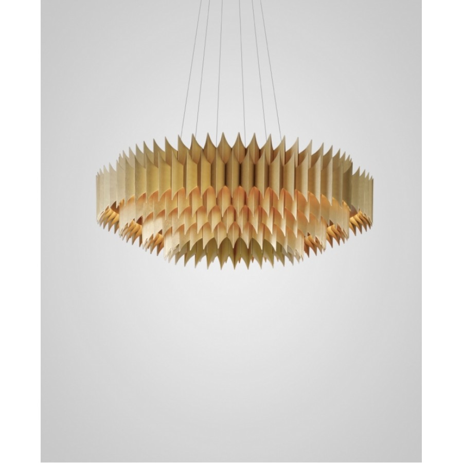 King is a majestic chandelier of significant proportions which intersects the boundaries of art and design. It is formed of individual brushed metal leaves which have been folded, tapered and brushed by hand to create multiple tiered rings, each concealing a hidden illuminated glow which envelopes the golden leaves, casting shadows and light, truly a sculpture in its own right.